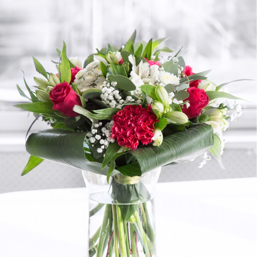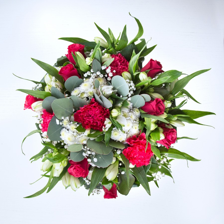 Our bouquet combines the romantic allure of red roses with the delicate beauty of white chrysanthemums and gypsophila. The elegant design is further enhanced with white alstroemeria and aspidistra leaves, offering a unique floral arrangement.