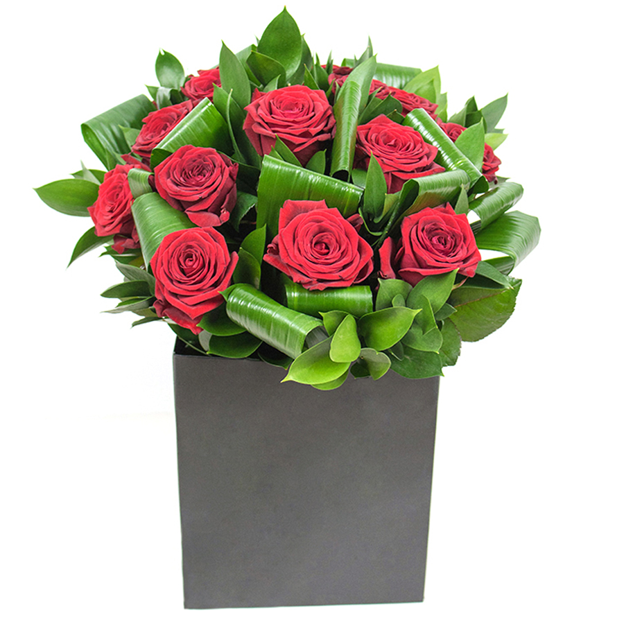 Bring grace and elegance to your home with our exquisite red rose bouquet, complemented by aspidistra leaves and ruscus. This beautifully designed arrangement is perfect for any occasion.